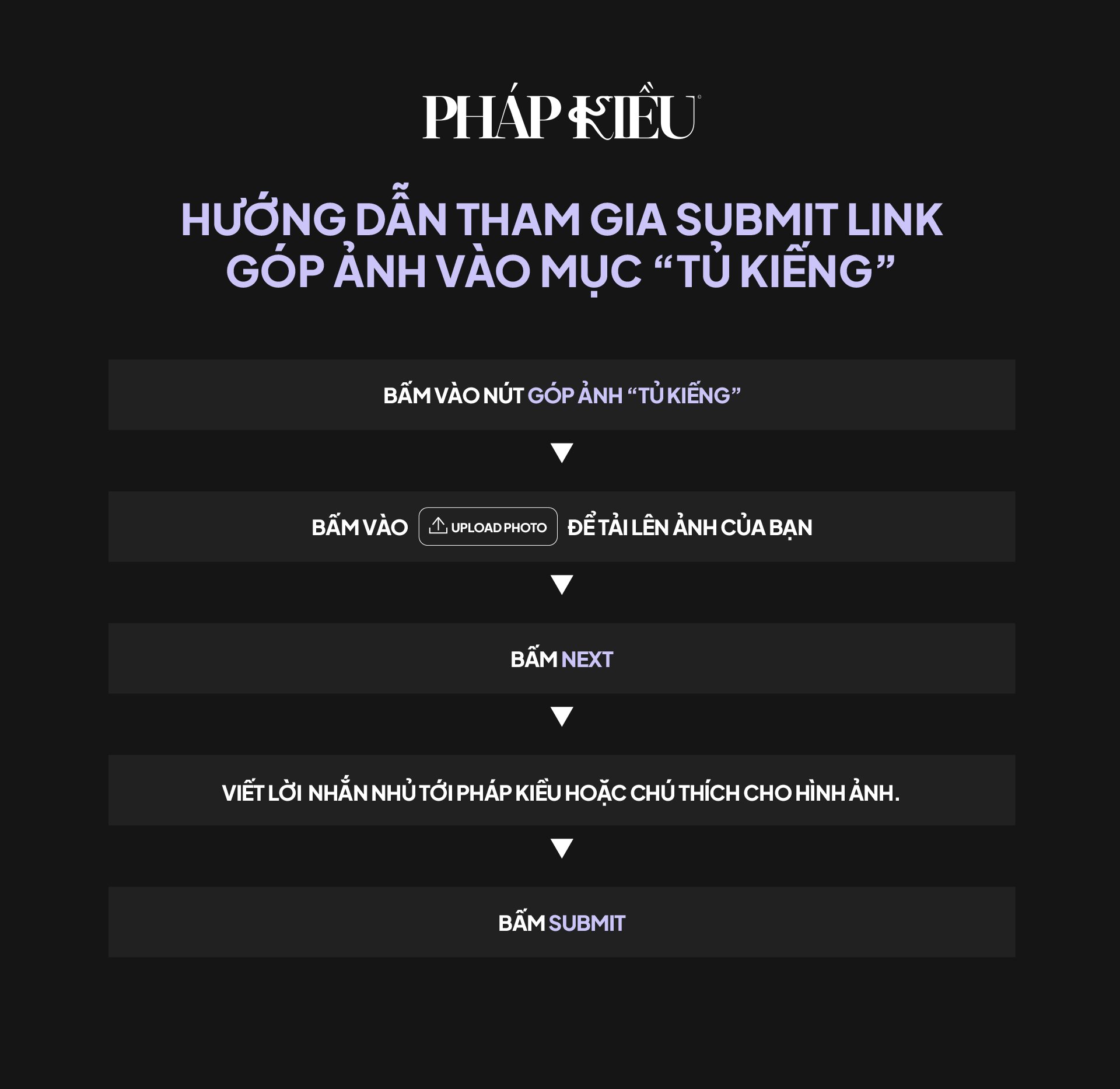 - Khi gửi ảnh, bạn đồng ý cho Pháp Kiều Official Platform được chọn lọc, biên tập và trưng bày trong “Tủ Kiếng” hoặc các hoạt động cộng đồng liên quan.